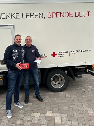 Das Deutsche Rote Kreuz und der stellvertretende Vorsitzende des Ortsvereins Sittensen, Stefan Tiemann, konnte sich bei Michael Kaiser für die 50. Spende persönlich mit einem kleinen Präsent bedanken.