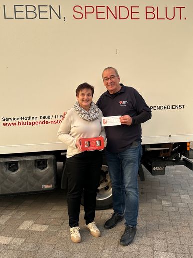 Das Deutsche Rote Kreuz und der Vorsitzende des Ortsvereins Sittensen, Jürgen Kiel, konnten sich bei Ulrike Ahrlich und Sören Evers für die jeweils 50. Spende persönlich mit einem kleinen Präsent bedanken.