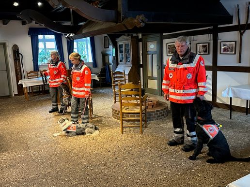 Die Anwesenden erfuhren dann von den Gästen, dass die Arbeit in der Rettungshundeabteilung ausschließlich ehrenamtlich erfolgt. Sowohl für die Hunde als auch für die Hundeführer ist jahrelanges und stetiges Training notwendig. Ebenso sind regelmäßige Rettungshundeprüfungen abzulegen. Die Hunde sind dann in der Lage z.B. als Flächensuchhund innerhalb von 20 Minuten eine Fläche von rund 30.000 Quadratmetern sicher abzusuchen oder als Mantrailer Menschen anhand ihres Individualgeruches sicher zu finden.